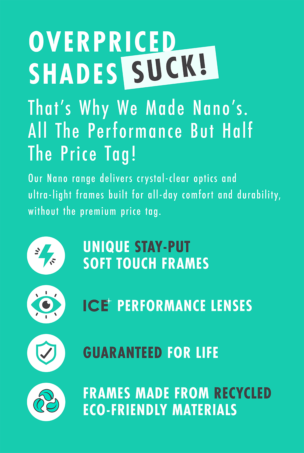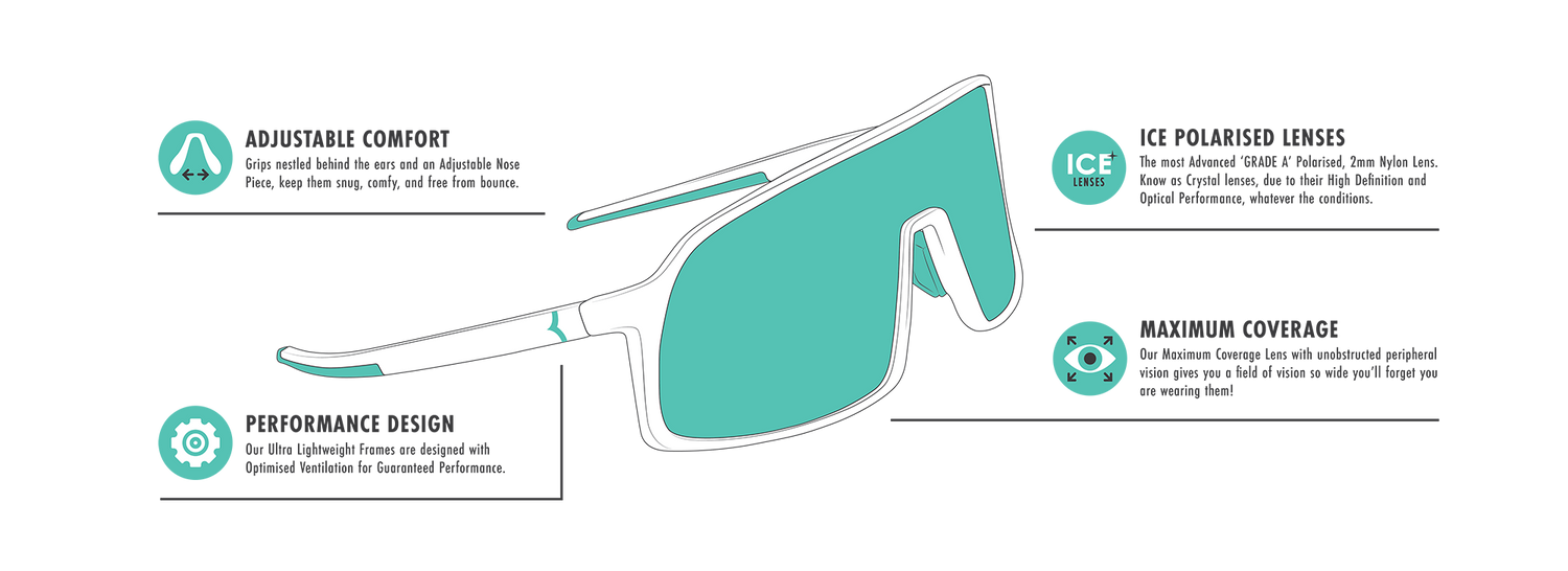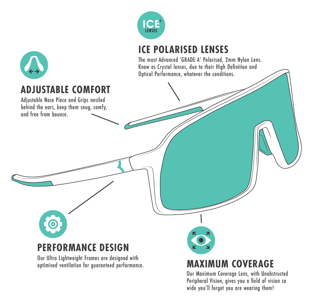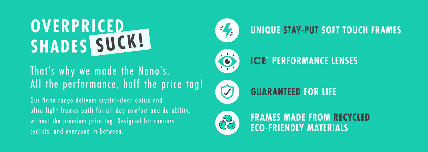 Our Nano Sunglasses aren’t just built to last, they’re designed to make you feel unstoppable. Equipped with our cutting-edge ICE lens technology, these shades deliver crystal-clear, high-definition optics, so every detail stays sharp, and your performance stays top-tier. The cylindrical design ensures a wide, unobstructed field of vision, so you’re never caught off guard, no matter where your adventure takes you.